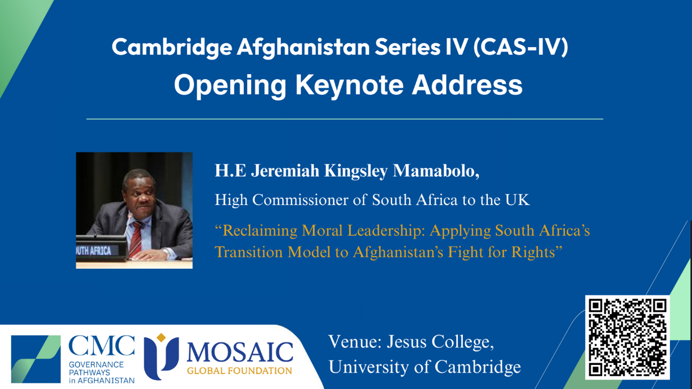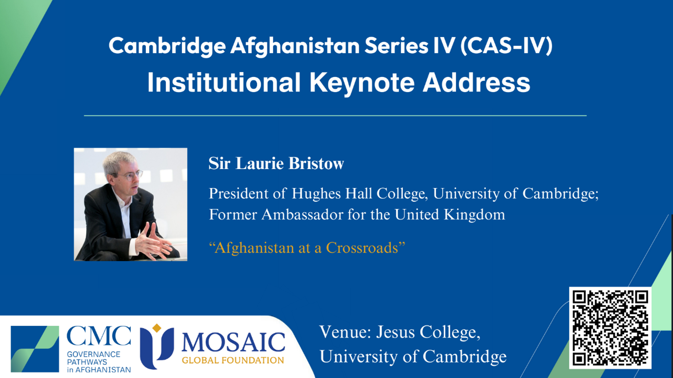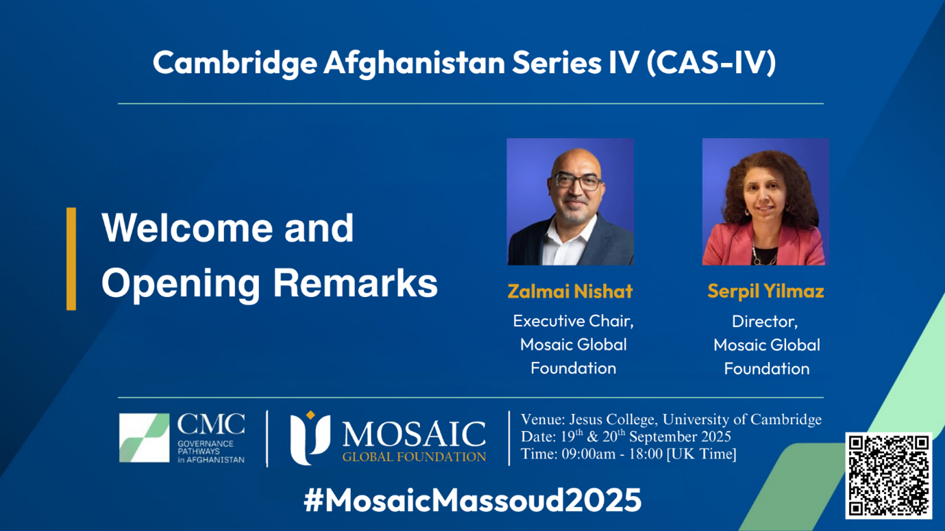 On 19–20 September 2025, the Mosaic Global Foundation convened the fourth round of its Cambridge Afghanistan Series (CAS-IV-2025) at Jesus College, Cambridge. The series is also known as Cambridge Massoud Conference (CMC) is part of "Governance Pathways in Afghanistan," a long-term project on re-imagination the state in Afghanistan to ensure it is based on historical and current realities of the diverse and plural society. Bringing together Afghanistan's politicians, academics, civil society leaders, resistance representatives, and international experts, this iteration of the series aimed at fostering coherence and unity between the democratic opposition to the Taliban.